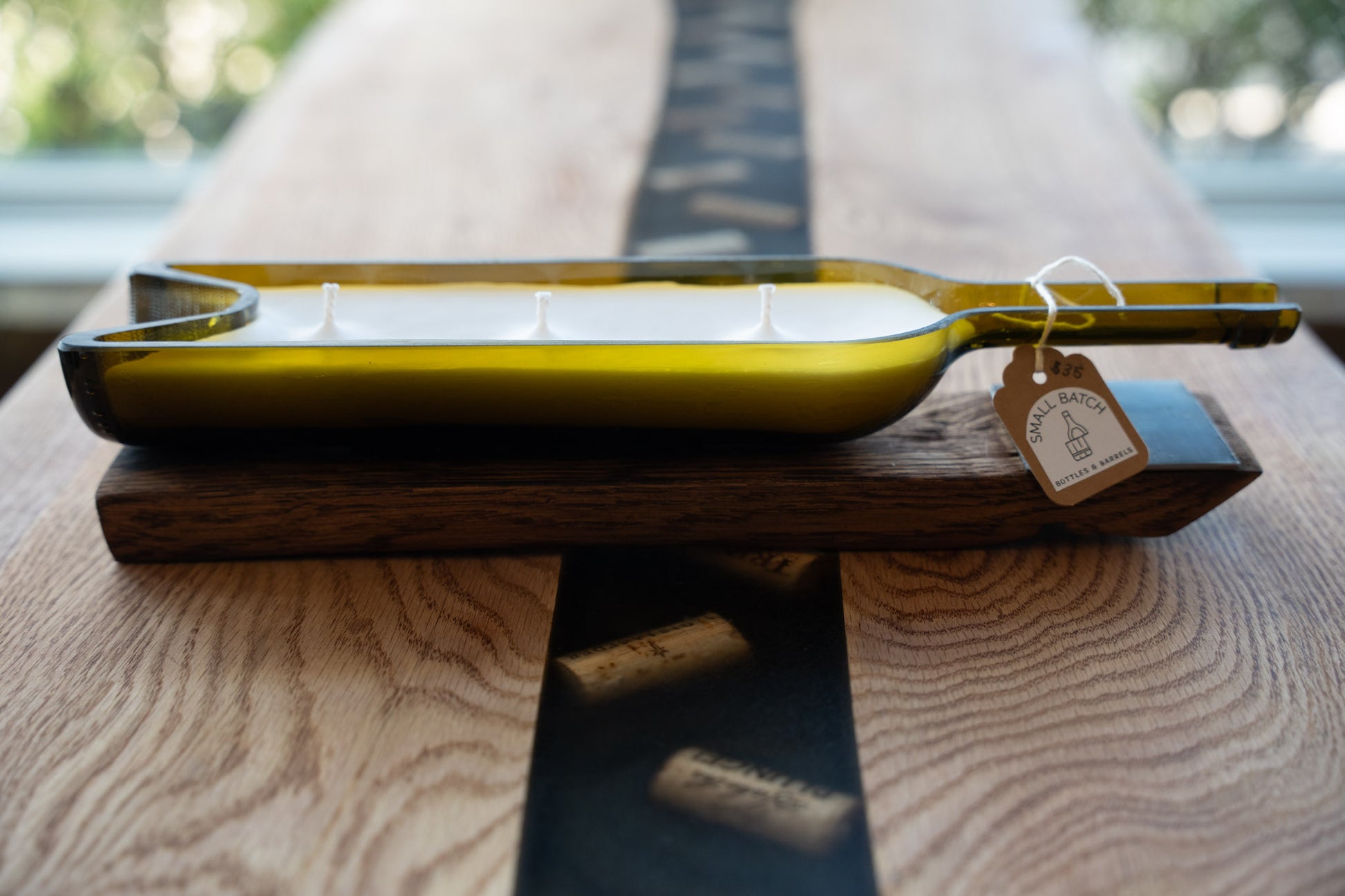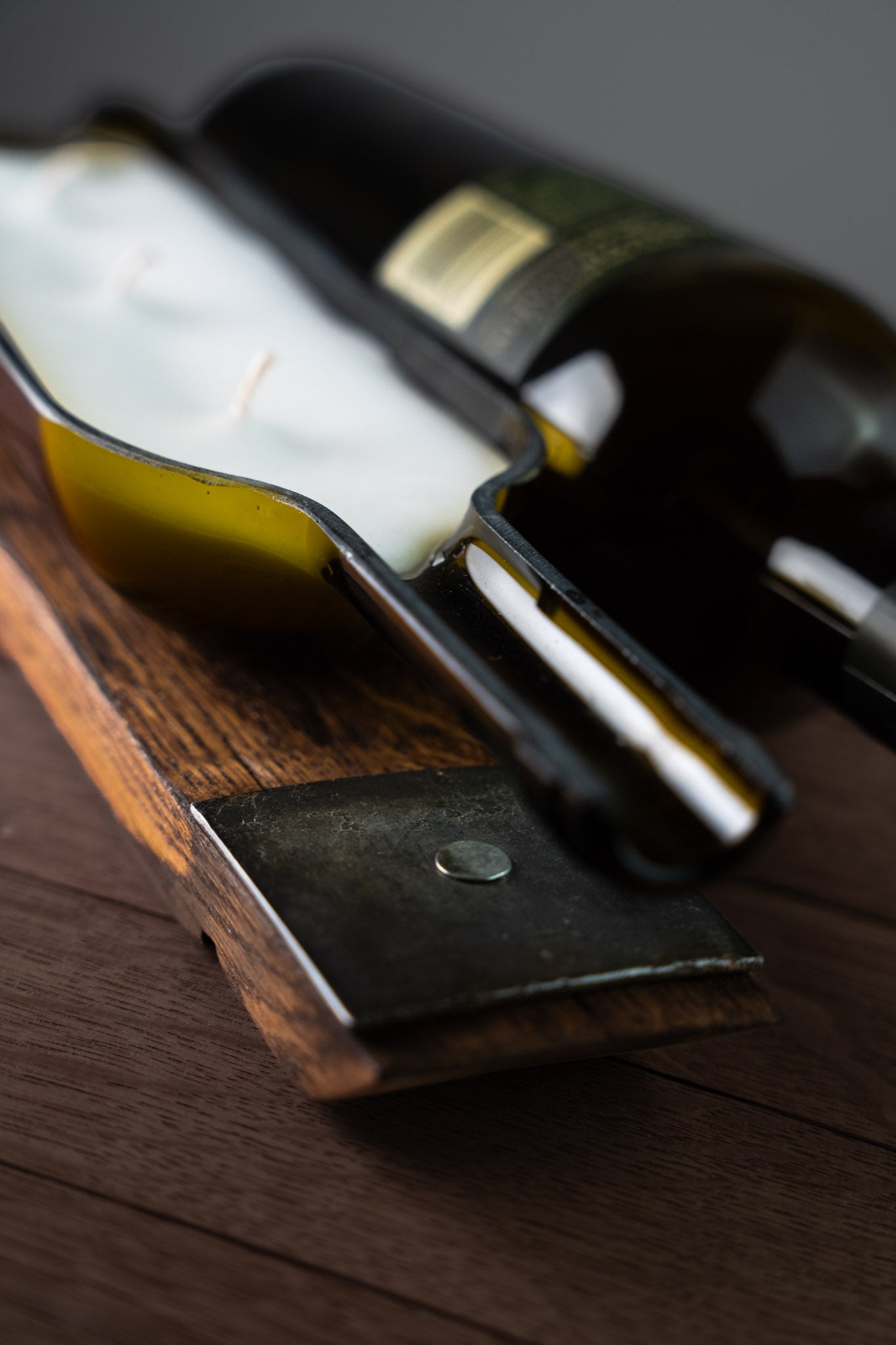 Upcycled wine bottle candle with scents that compliment the aromas from the vineyard. Each candle comes with a refurbished barrel stave stand that makes this candle a decorative necessity for your home. After the candle has completed its burn, it can simply be cleaned out and turned bowl decor.