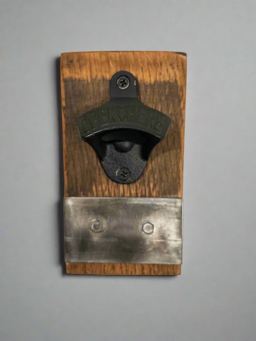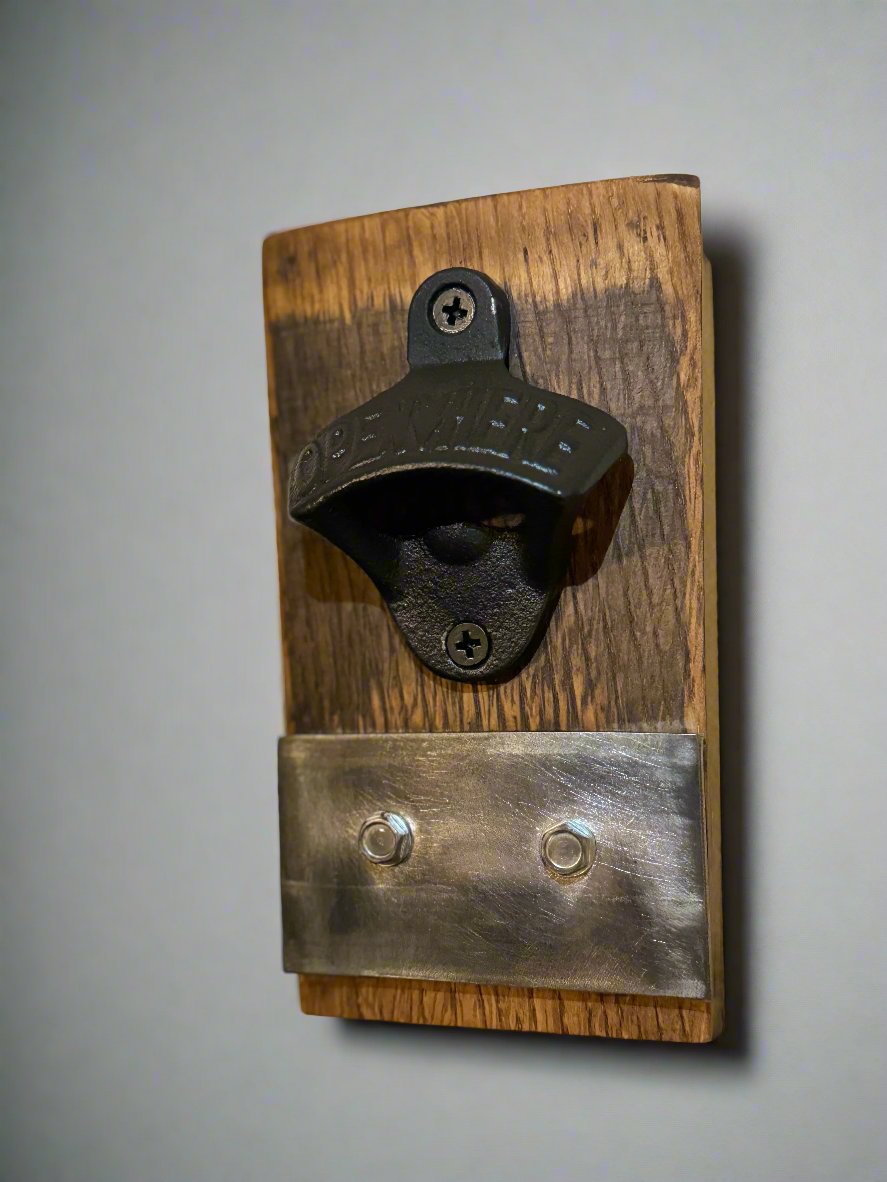 While the ladies are having wine night, crack open a cold one with a bottle opener made from a retired barrel!