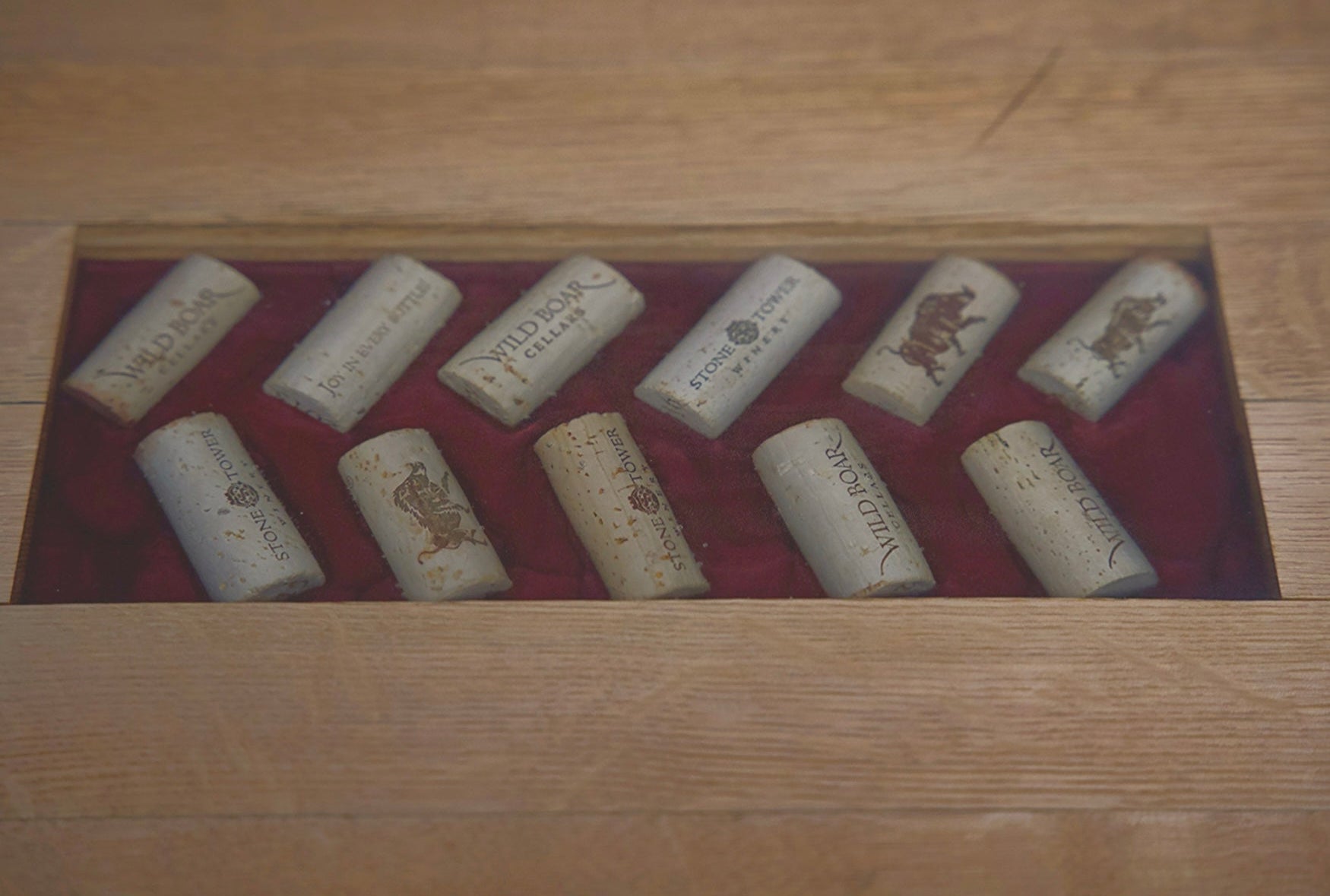 - Cork & Epoxy Inlay: Recycled corks from some of your favorite wineries in wine color themed epoxy inlay